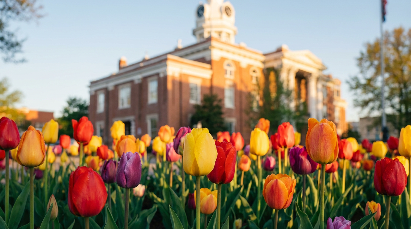The courthouse stands proudly at the center, framed by colorful tulips, daffodils, and seasonal plantings that bring vibrancy to every corner.