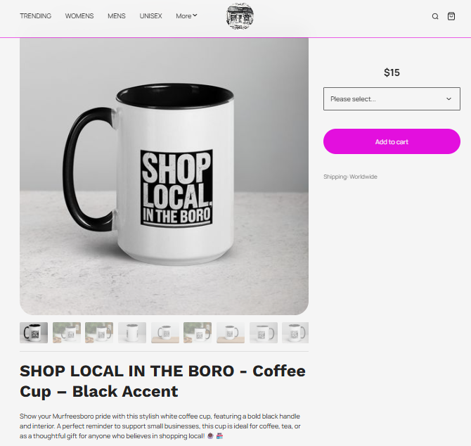 We love seeing shoppers in our “SHOP LOCAL, IN THE BORO” raglans, sipping from their pink-accented mugs, knowing they’re repping more than a brand—they’re celebrating a shared hometown spirit.