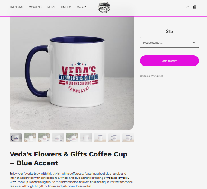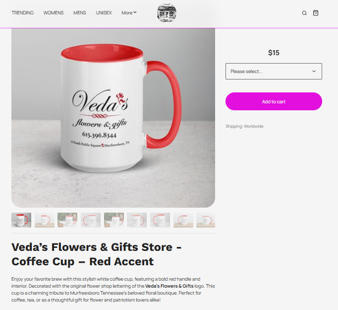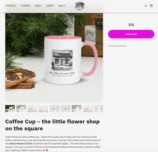 At Veda’s, we’re not just selling flowers—or mugs, or tees. We’re celebrating a legacy of love, faith, and family perseverance. As a women-owned and operated business, our shop grew from humble beginnings to become a cornerstone of Murfreesboro’s historic square.