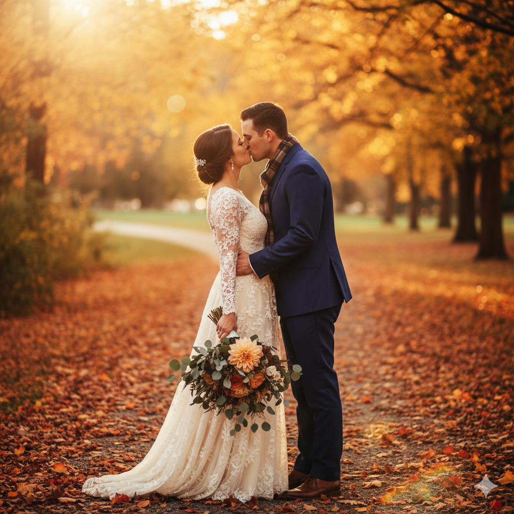 Whether she dreams of soft, romantic tones or bold autumn hues, the changing season offers a natural backdrop of golden leaves, warm sunsets, and rustic charm that complements just about any vision.