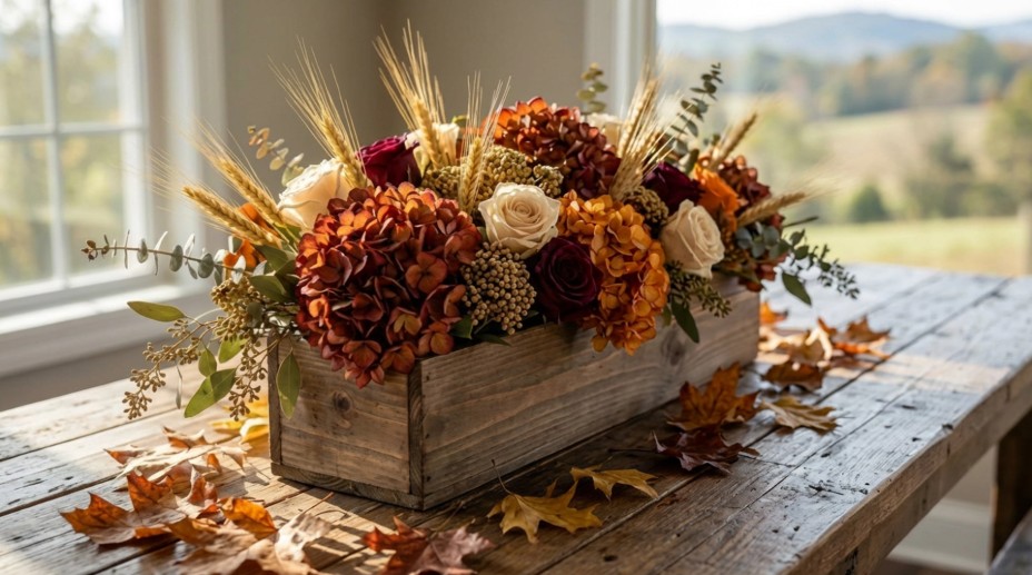 This lush arrangement combines fall hydrangeas, roses, wheat, and eucalyptus in a rustic wooden box — perfect for long farmhouse tables. It symbolizes abundance, family, and the beauty of life’s simple blessings.