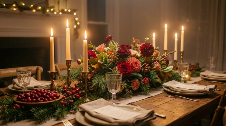 A timeless favorite featuring taper candles surrounded by fresh blooms, berries, and pine accents — the perfect centerpiece to transition from Thanksgiving to early Christmas gatherings.