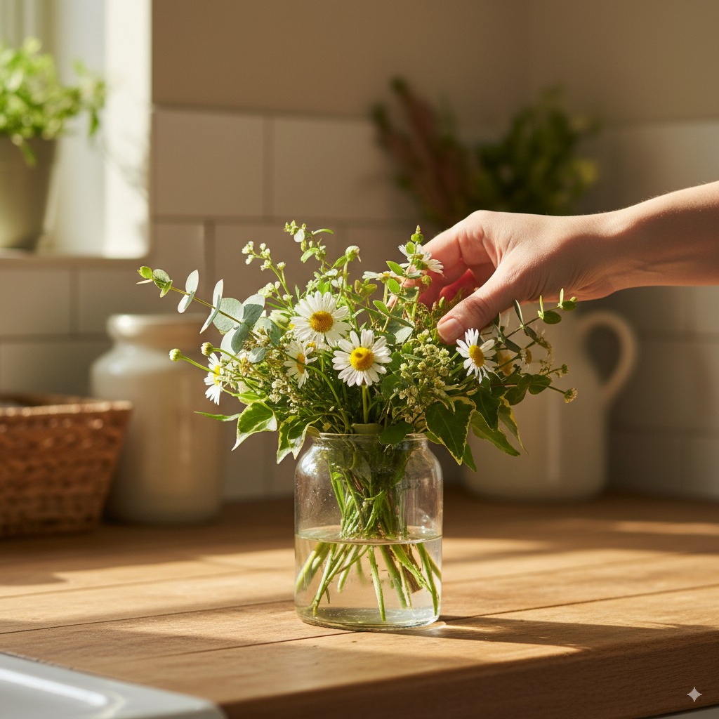 Flowers love a cool spot, away from direct sunlight, vents, and appliances. A shaded table or shelf is ideal for prolonging freshness.