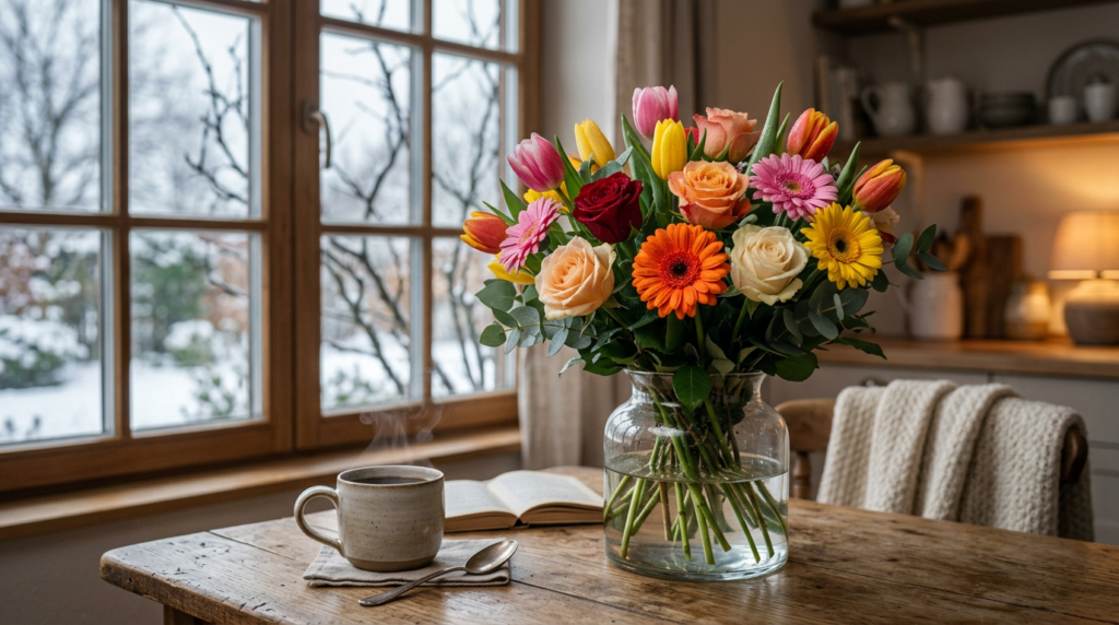 A vibrant mix of gerbera daisies and roses on the kitchen table becomes more than décor. It becomes a reminder that life is still blooming, even when the trees outside are bare.